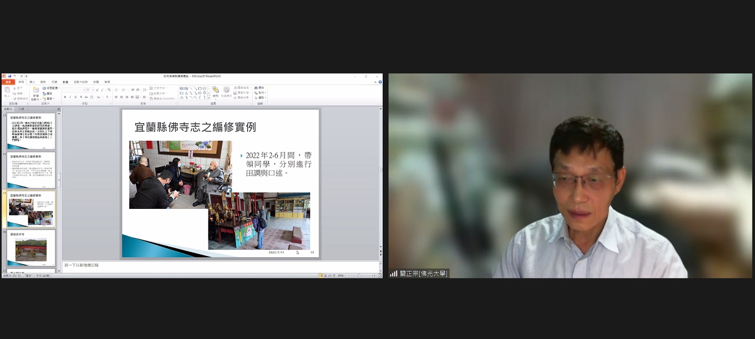 長年研究佛教史的闞正宗,簡要說明《中國佛寺志》一書的由來與歷史發展,他提到,明清時期始大量編寫佛教山志,「2011年根據大陸學者的統計,明代現存87種,亡佚65種,主要原因為刊刻數量稀少,流通不易。」 而當代山志的彙編與數位化,對佛教歷史的流傳別具意義。法鼓佛教學院圖書資訊館,2007年啟動「中國佛教寺廟志數位典藏」專案計畫,將當代2部具有高度宗教與歷史研究價值的典籍—《中國佛寺史志彙刊》與《中國佛寺志叢刊》,進行了全文數位化,藉由數位媒體無償對外開放,讓世人所用。 山志編纂可以「彰往示來」、「造廢興之迹」,在佛寺傳承上佔有重要一席之地。2021年,佛光山佛光大學佛教學系研究所結合理論與實務,開設「寺院田調與口述專題」和「寺志撰寫理論與實務」課程,透過宜蘭縣佛教會的安排,選定頭城吉祥寺、羅東菩提寺、員山明光寺,透過歷史文獻、報章雜誌、寺院鐘銘、牌位、牌匾及老照片完成史料收集。2022年2至6月,闞正宗帶領碩博士生進行田野調查與口述訪問,預計年底出版《宜蘭縣佛寺志》第一集,之後預計每年出版一集,逐續完成。 「寺院是文化載體、僧侶活動的軌跡、法脈傳承延伸,更是佛教歷史演變的重要組成部分。」寺志的編纂有助於鑑古知今,了解前人開山篳路藍縷的艱辛過程、祖輩的活動軌跡。闞正宗有感於台灣當代佛教寺志的匱乏,未來職志將繼續投入台灣佛寺歷史發展的實錄,為後世留下台灣佛教文化發展的足跡。 中華人間佛教聯合總會秘書長覺培法師,感謝佛光大學佛教學院院長郭朝順主持、闞正宗等3位教授參與的佛教史實人才培訓計畫,為佛教歷史做出重要貢獻。期盼聯合總會與培訓團隊合作,未來編纂台灣瀕危寺廟以外,擴及在地具重要歷史定位的寺院,為佛教留下歷史。